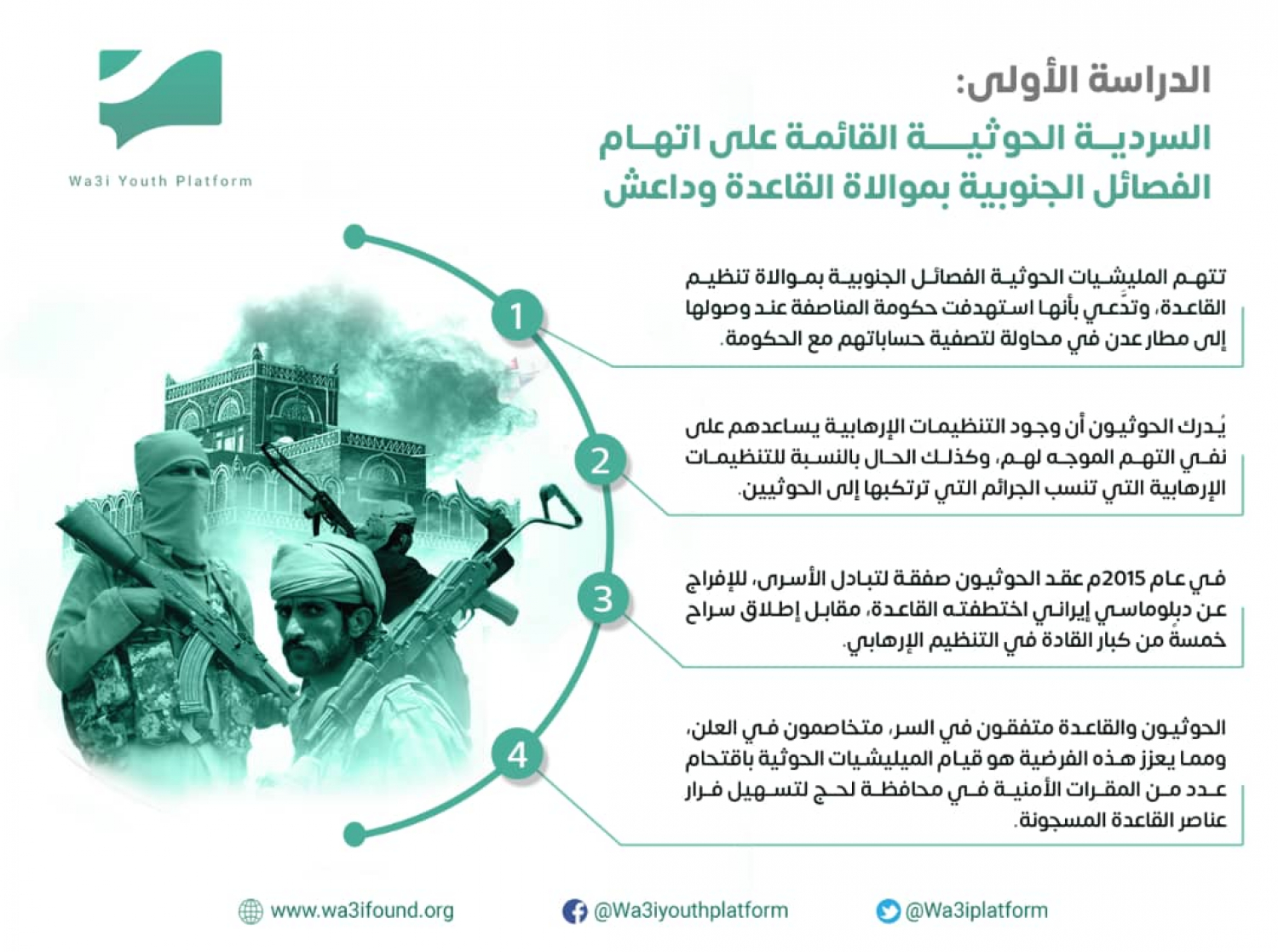 منذ قيامهم بالانقلاب على جزءٍ من الجمهورية اليمنية، أدركت الميليشيات الحوثية أن السيطرة على ما تبقى من الجمهورية لا يقتصر على المد العسكري فحسب، بقدر ما يمتد حتى يشمل حملات إعلامية تشنها الميليشيات الحوثية في محاولة لتضليل الرأي العام، الأمر الذي يؤثر بشكل سلبي على معنويات المكونات التي تحاربها، ومن يتمعن في السردية الحوثية على وسائل الإعلام يرى حجم المعلومات المُضلِّلة، والحقائق المزورة التي نشرتها الميليشيات الحوثية، أدناه نترك لكم دراسةً تم إجراؤها لبيان السردية الحوثية التي تقوم على اتهام المكونات الجنوبية بموالاة القاعدة وداعش، للإطلاع وتحميل الدراسة كاملة يُرجى الضغط على الرابط التالي: