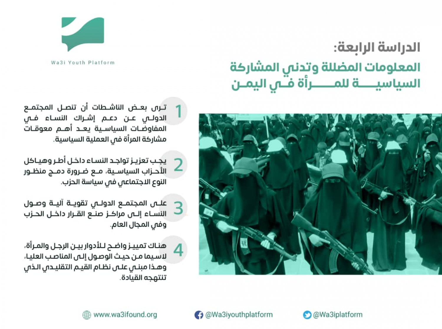 في الآونة الأخيرة يُلاحَظ أن مشاركة المرأة اليمنية في العملية السياسية بات متدنيةً أكثر من أي وقت مضى، في الزمن الذي يُنادى فيه بضرورة إشراك في المجال السياسي؛ تُصدم المرأة اليمنية بغياب النساء عن التشكيل الحكومي الجديد في حكومة المناصفة، وهو ما دفع البعض ليتساءل: هل يعود السبب في غياب المرأة عن المشاركة في العملية السياسية في اليمن إلى ضعف المخرجات لدى الناشطات في المجال السياسي؟ أم أن المسألة ذات ارتباط بالنظرة الدونية تجاه المرأة في مجتمع يُذكِّرُ كل شيء حتى اللغة؟ وللإجابة عن تلك التساؤلات قامت منصة شباب وعي بإجراء هذه الدراسة، للاطلاع عليها يُرجى الضغط على الرابط التالي.